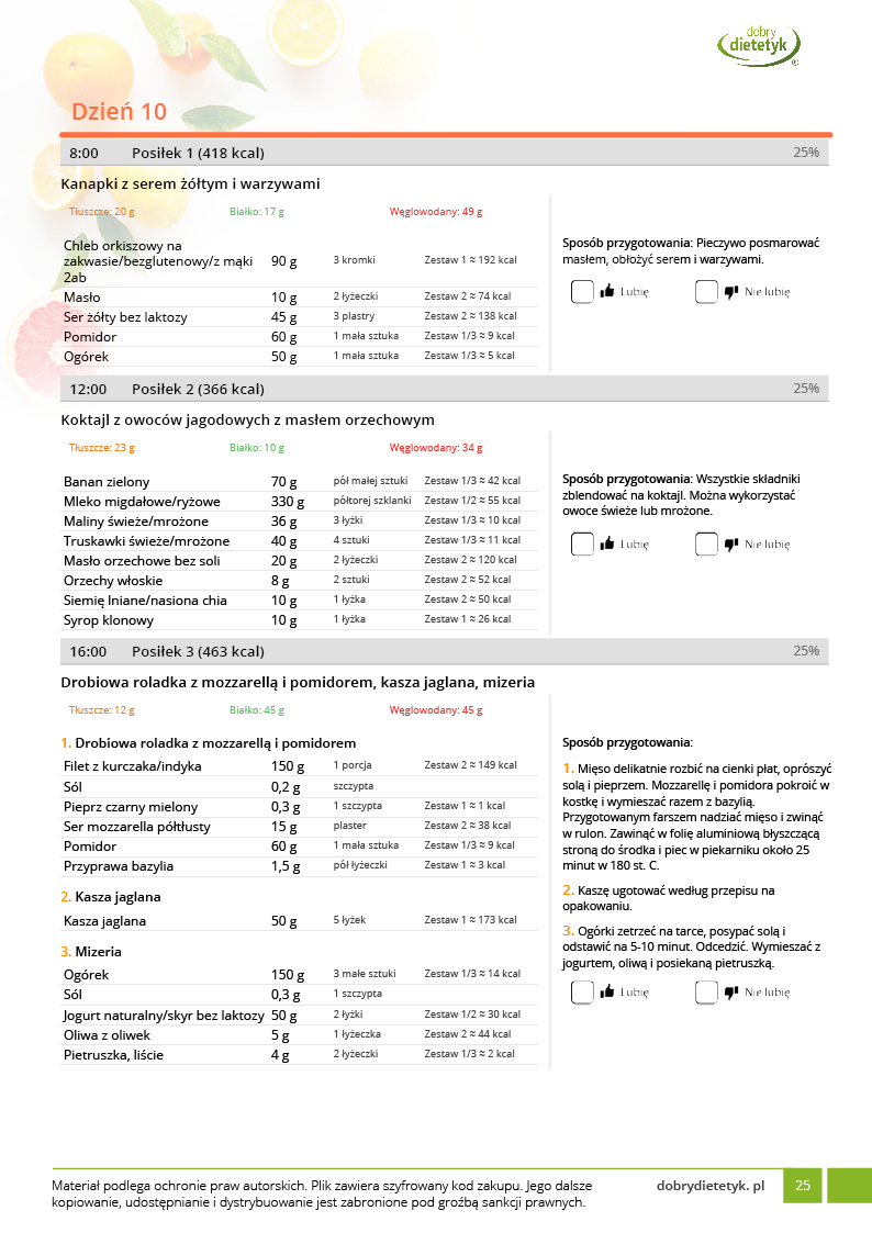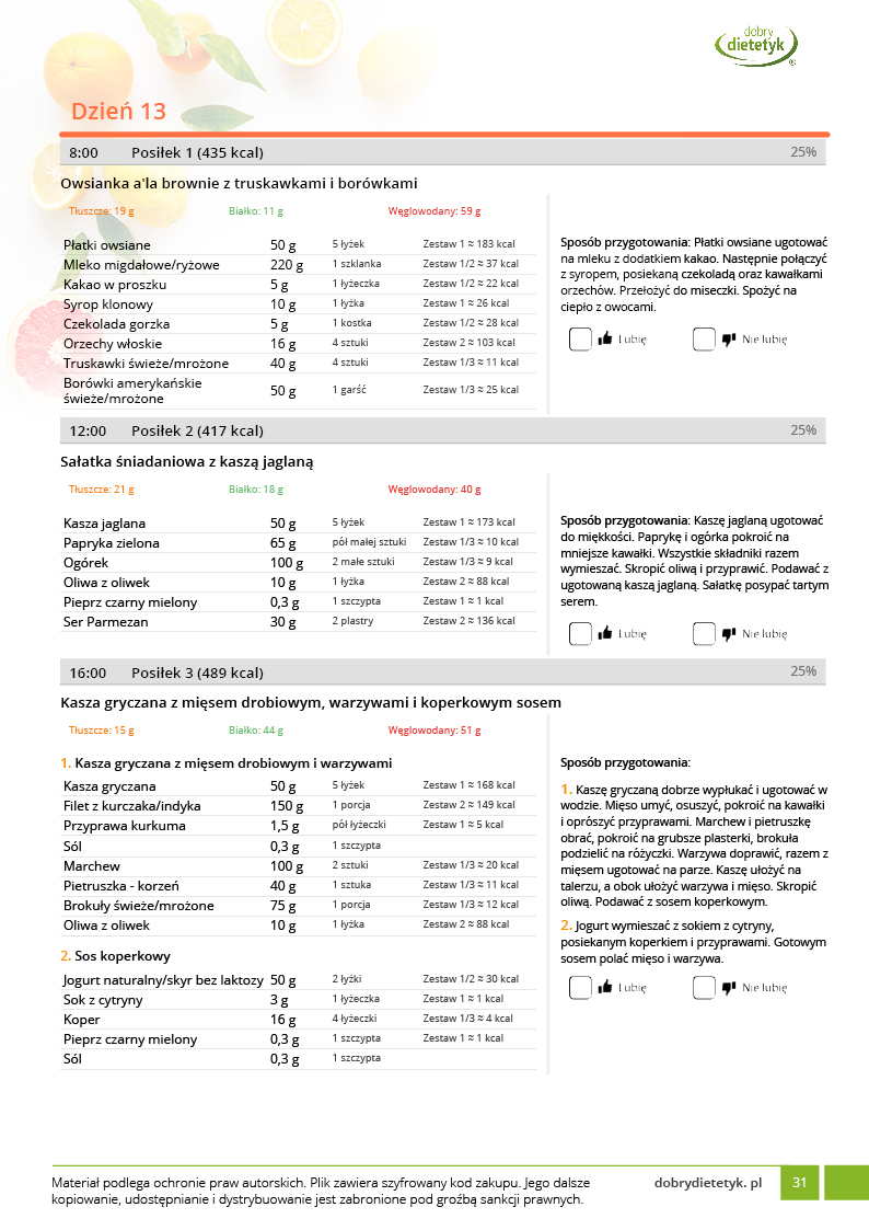 w formie propozycji posiłków (zamiast pojedynczych jadłospisów jednodniowych, przygotowano propozycje kilku propozycji dań na każdy posiłek). Tutaj nie uzależniamy Cię od tego jakie masz np. w danym dniu zjeść śniadanie czy obiad, tylko sam wybierasz sobie ulubione danie z kilku przedstawionych przez nas propozycji.