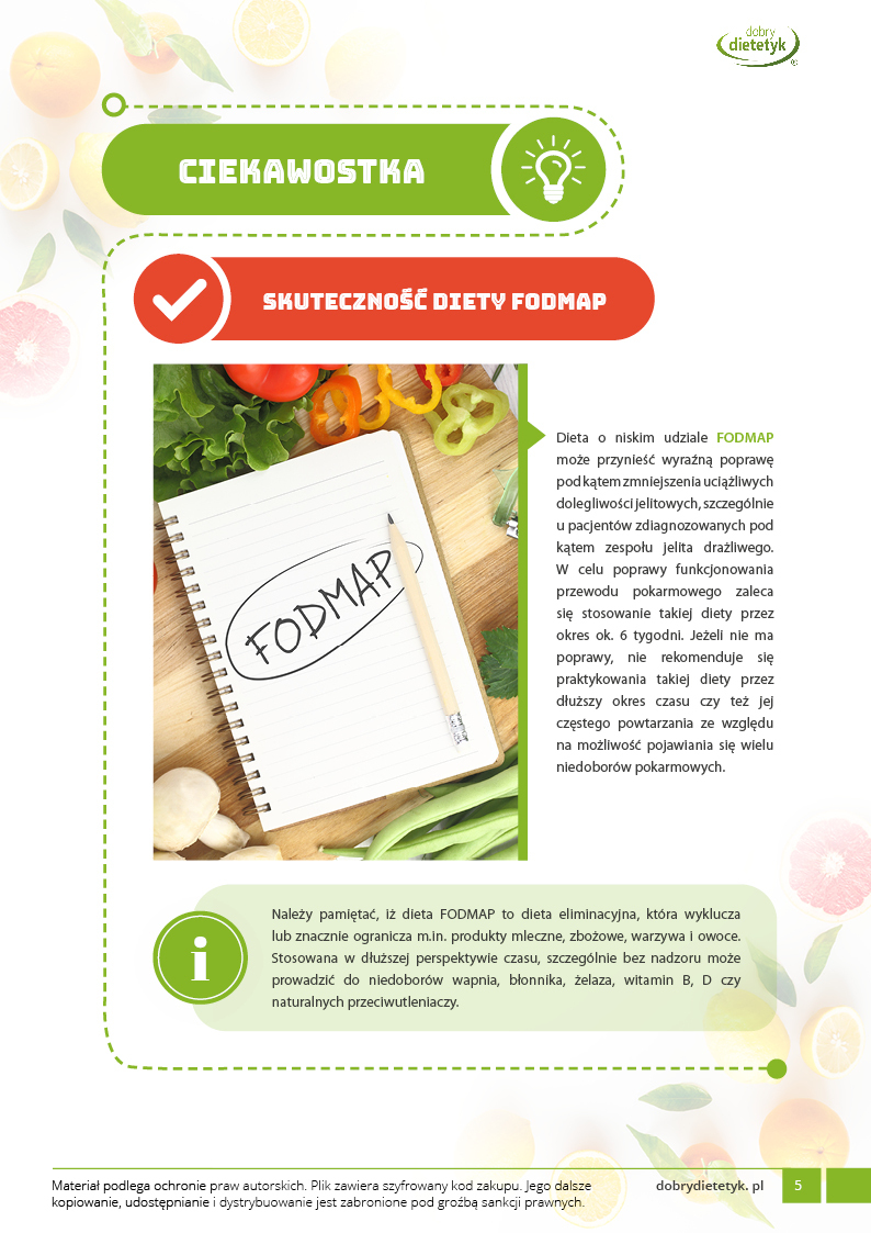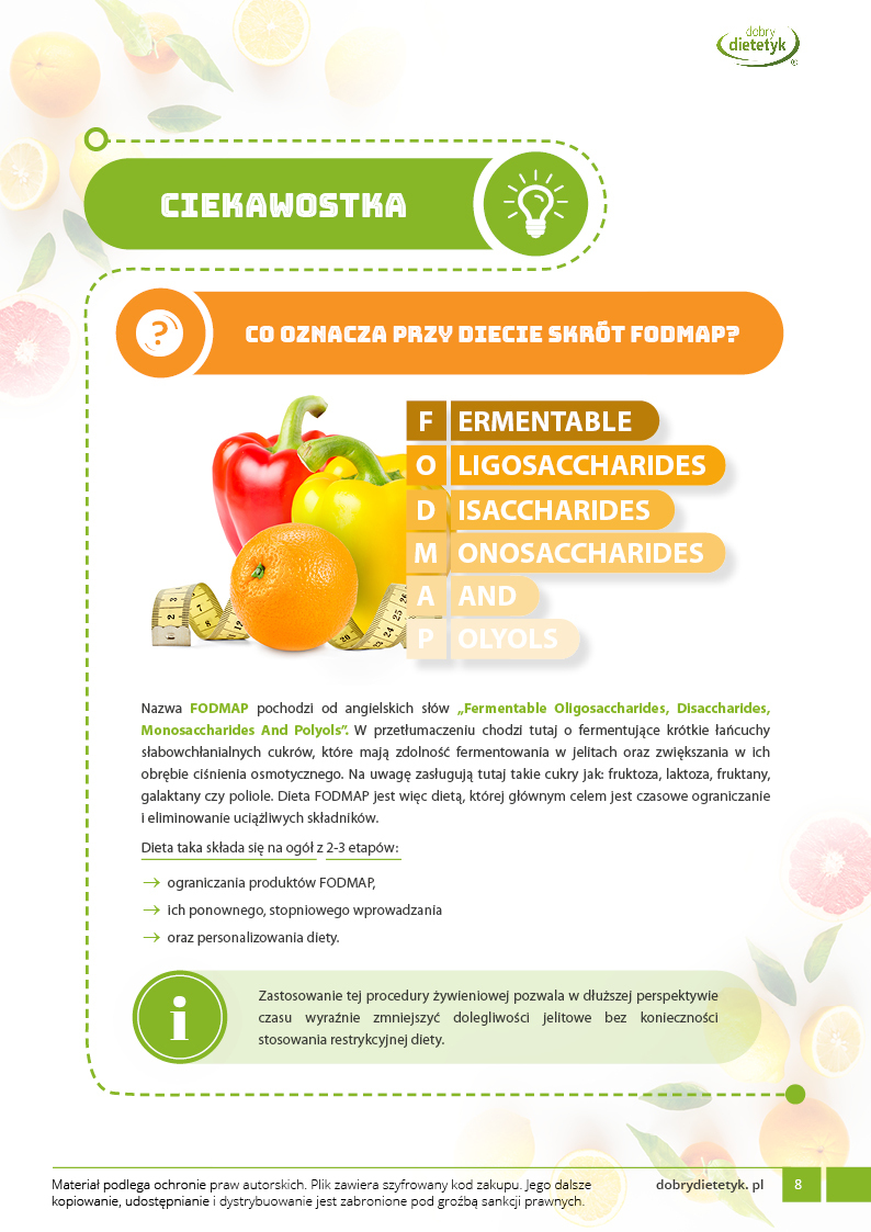 Specjalistyczny 14-dniowy program dietetyczny FODMAP z ukierunkowaniem na ograniczenie cukrów fermentujących, w szczególności fruktozy (zawartej głównie w owocach, miodzie czy słodyczach), laktozy (zawartej w produktach mlecznych), fruktanów (zawartych w pszenicy, czosnku czy cebuli), galaktanów (zawartych w roślinach strączkowych) oraz polioli (takie jak sorbitol czy ksylitol).