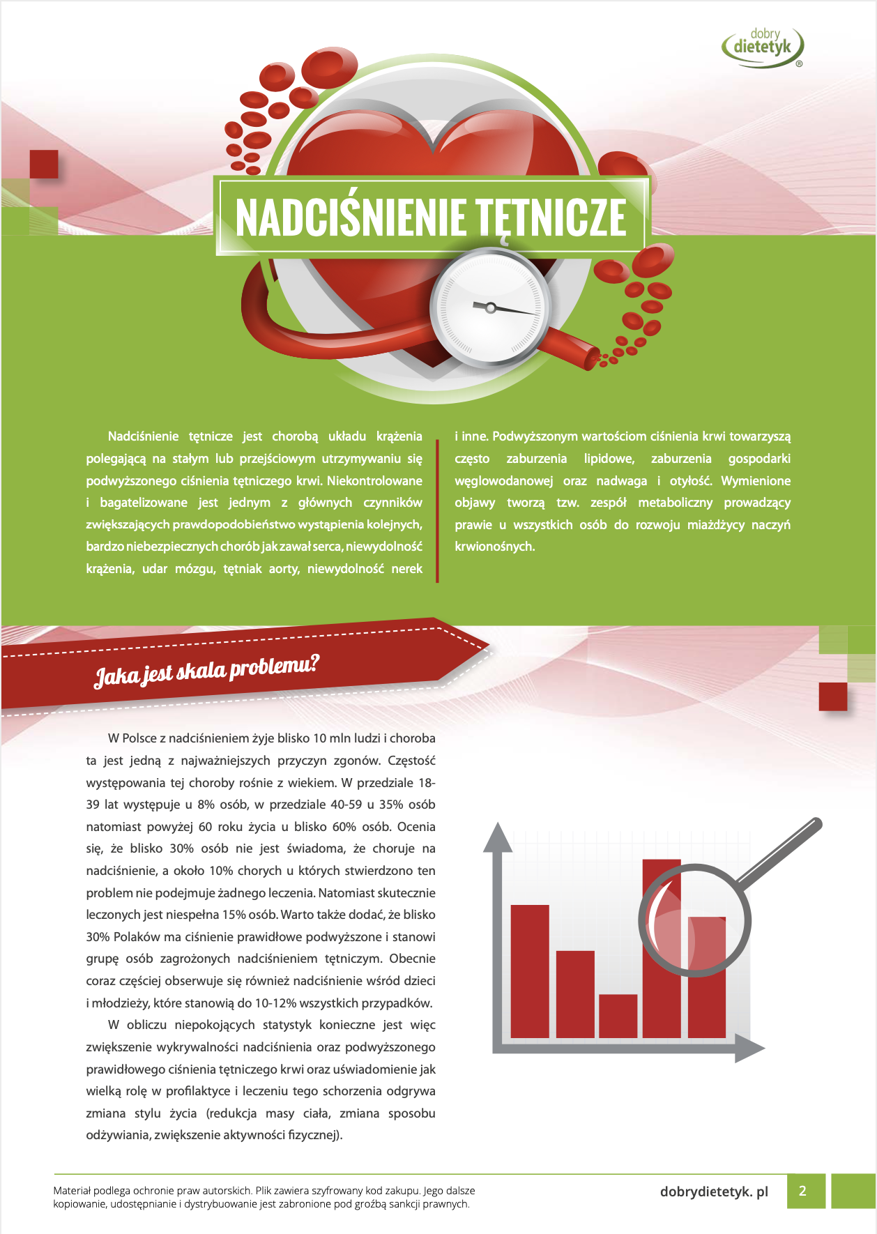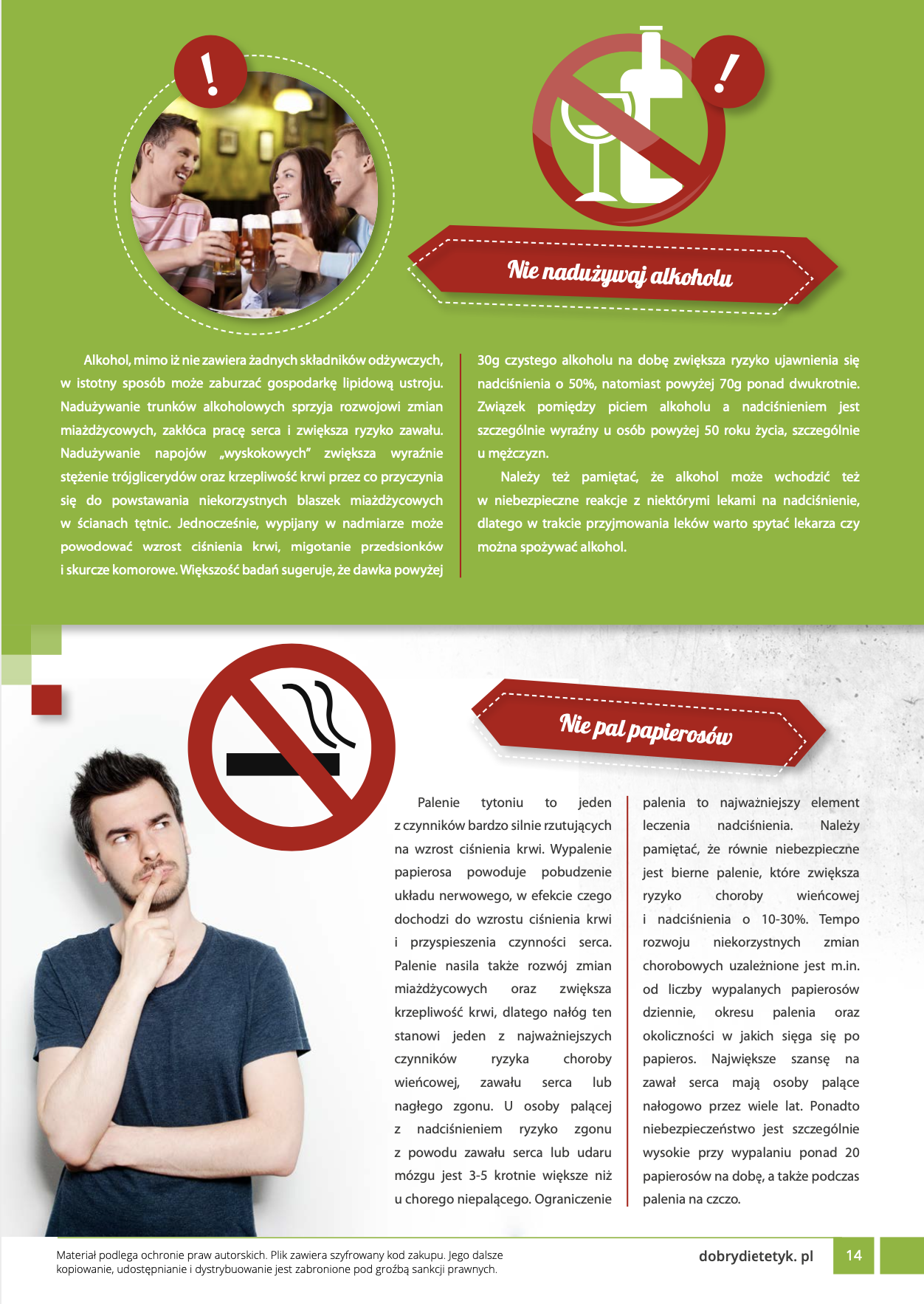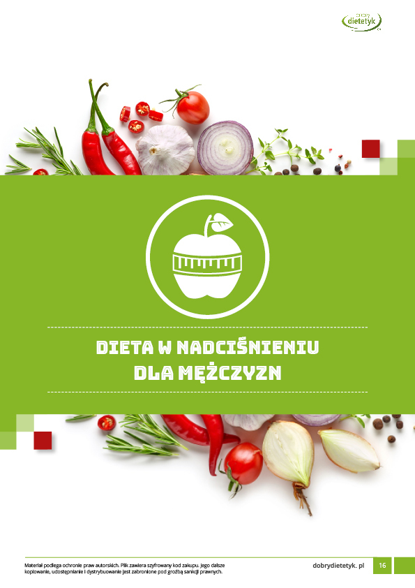 Kompleksowy program żywieniowy dla MĘŻCZYZN zmagających się z problemem nadciśnienia tętniczego. Opracowanie zawiera specjalnie przygotowany przewodnik edukacyjny oraz 30-dniowy jadłospis wspomagający redukcję podwyższonego ciśnienia krwi. W diecie zwrócono szczególną uwagę na podaż składników odżywczych wpływających na relaksację i zdrowie naczyń krwionośnych. Obok uwzględnienia ogólnych potrzeb żywieniowych mężczyzn, zadbano m.in. o podaż odpowiedniej ilości sodu potasu, zachowanie odpowiednich proporcji między tymi składnikami a także dostarczenie zwiększonej ilości kwasów omega-3, które wpływają na procesy rozkurczowe naczyń krwionośnych. W przygotowanej diecie zwrócono także uwagę na ograniczenie podaży składników o działaniu miażdżycorodnym a także zwiększono podaż witamin chroniących naczynia krwionośne przed uszkodzeniem. Dieta sprawdzi się także idealnie w programach redukcji wagi u mężczyzn, w chorobach układu krążenia a także jako dieta po zawale.