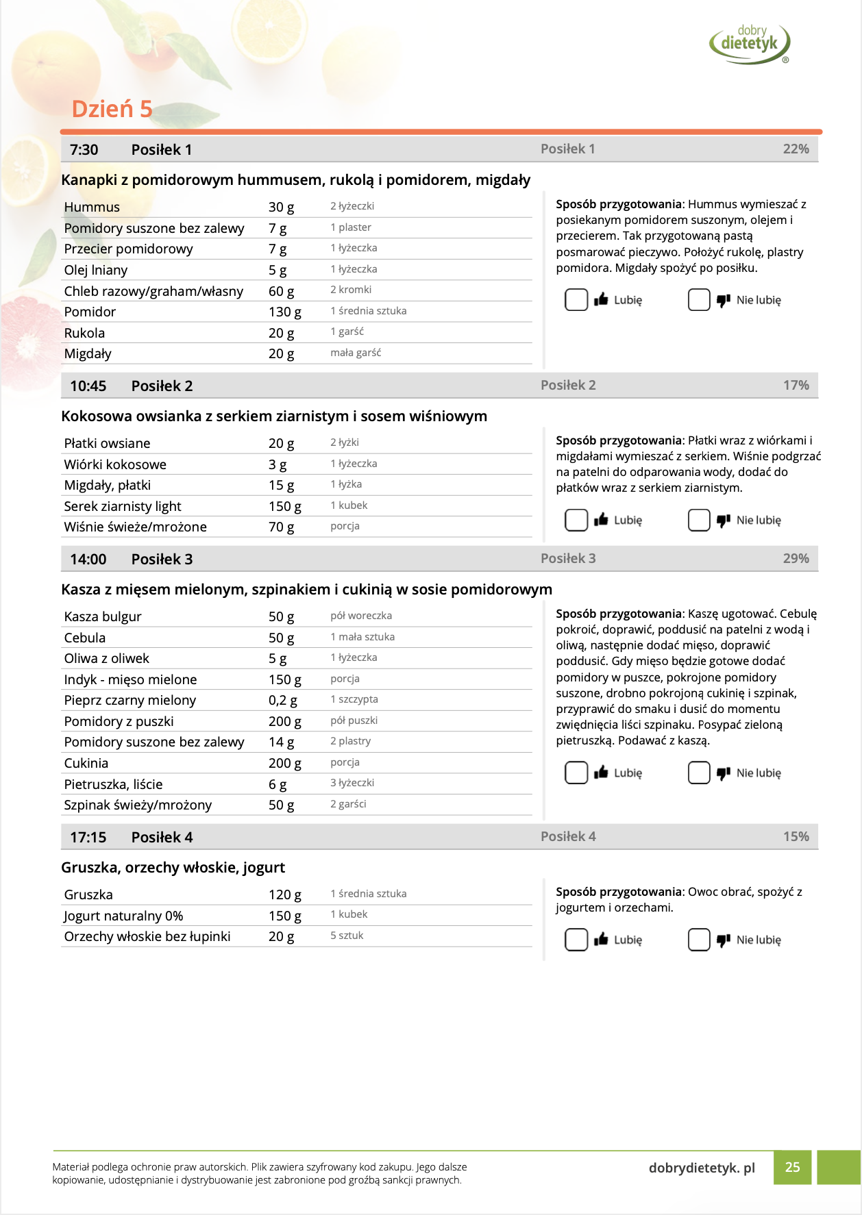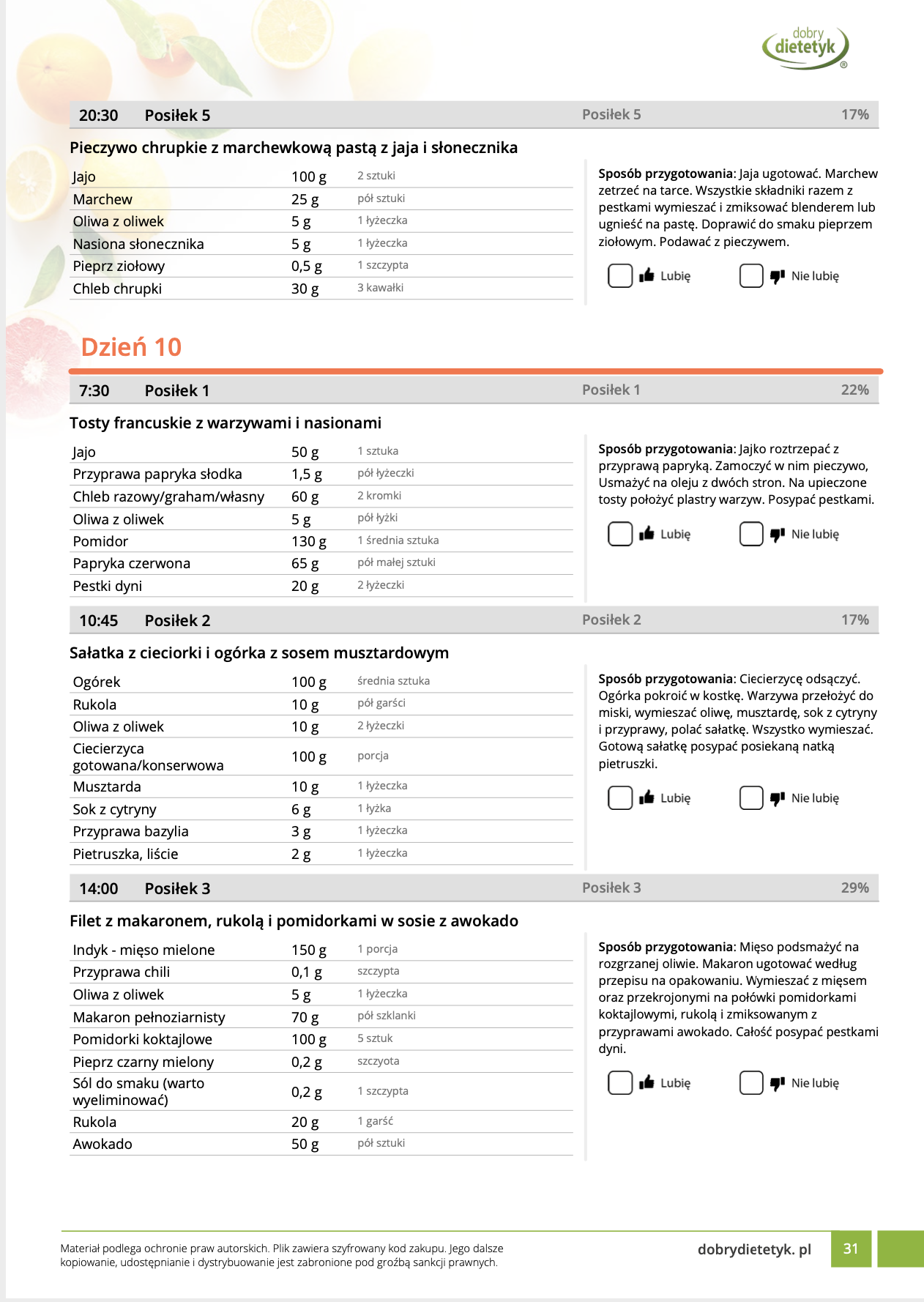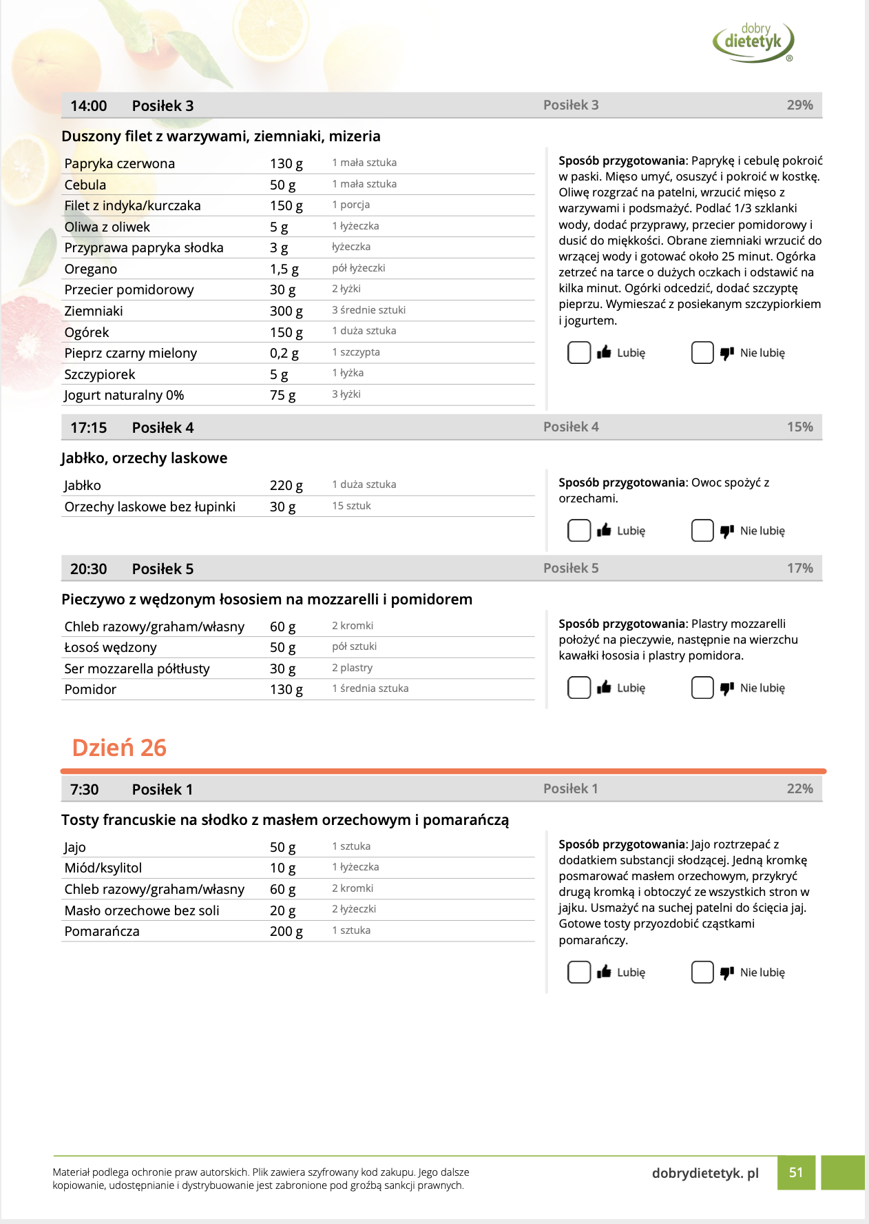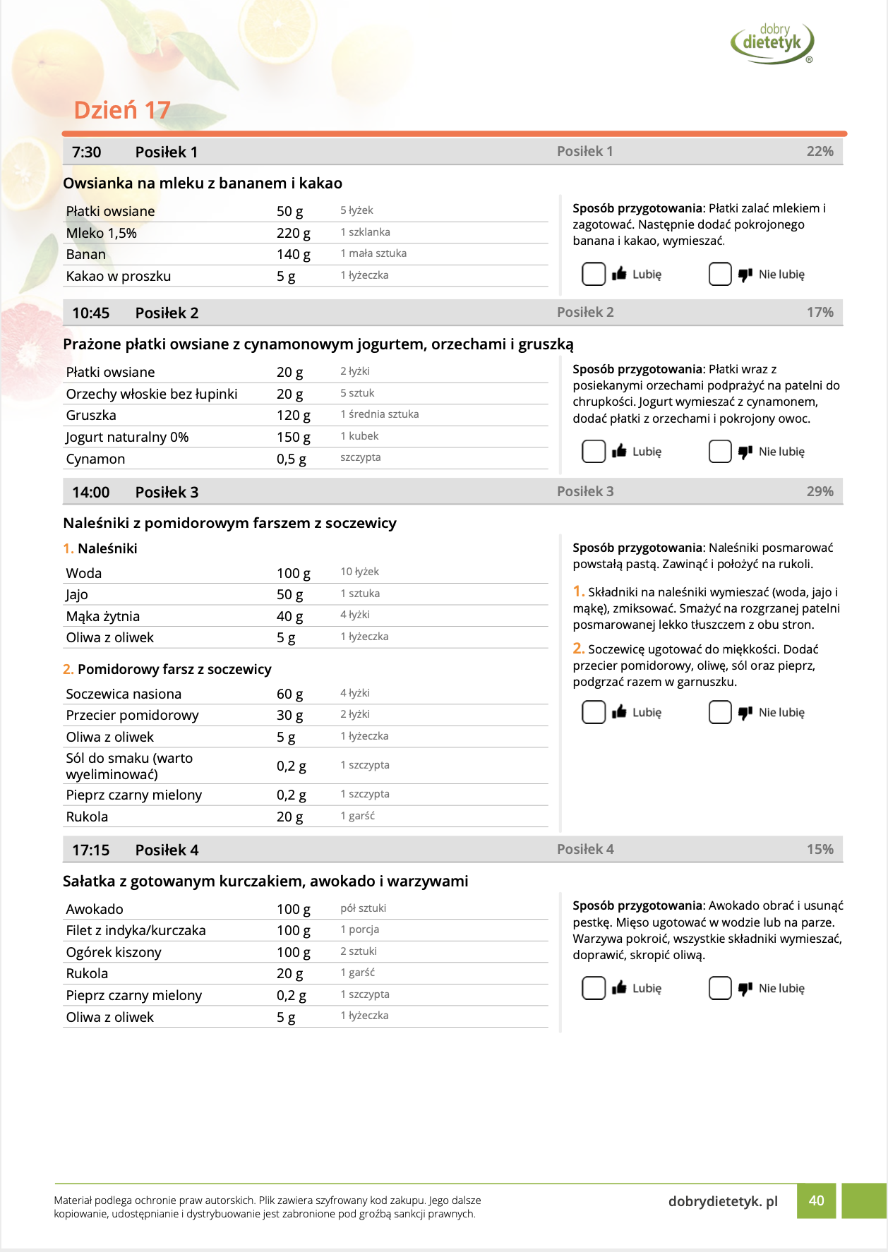 w formie propozycji posiłków (zamiast pojedynczych jadłospisów jednodniowych, przygotowano propozycje kilku propozycji dań na każdy posiłek). Tutaj nie uzależniamy Cię od tego jakie masz np. w danym dniu zjeść śniadanie czy obiad, tylko sam wybierasz sobie ulubione danie z kilku przedstawionych przez nas propozycji.