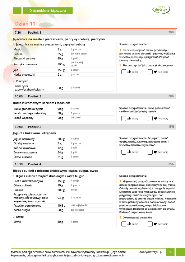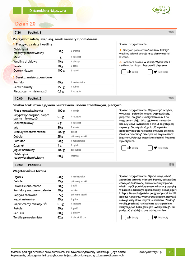 w formie propozycji posiłków (zamiast pojedynczych jadłospisów jednodniowych, przygotowano propozycje kilku propozycji dań na każdy posiłek). Tutaj nie uzależniamy Cię od tego jakie masz np. w danym dniu zjeść śniadanie czy obiad, tylko sam wybierasz sobie ulubione danie z kilku przedstawionych przez nas propozycji.
