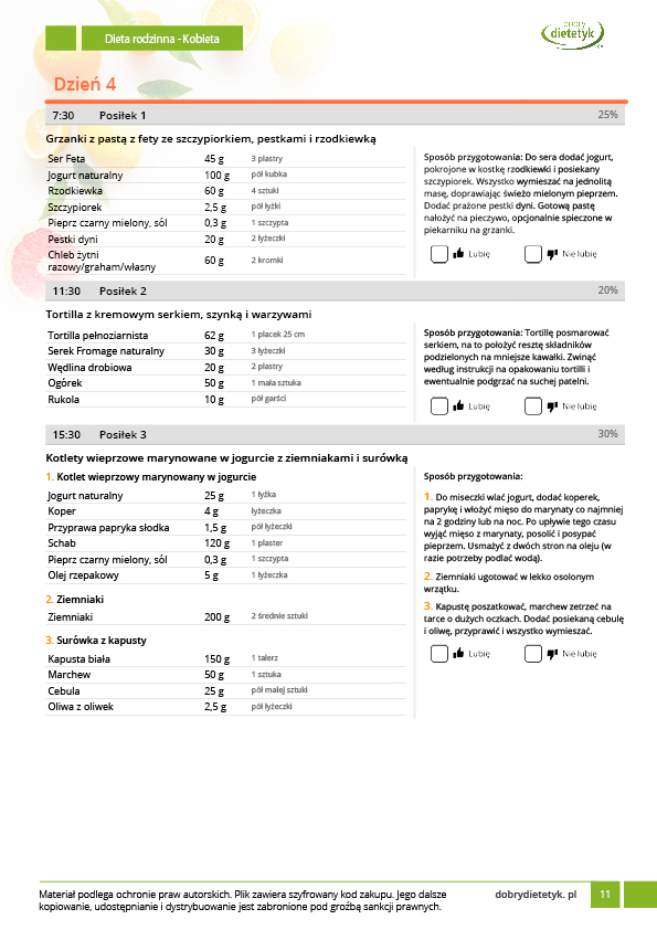 Specjalnie opracowany Program Żywieniowy dla CAŁEJ RODZINY, która wspólnie chce zadbać o zdrowy sposób odżywiania względnie uporać się z nadmiarem kilogramów. Opracowanie zawiera dwa 30-dniowe jadłospisy: oddzielny dla mężczyzny (2000kcal) i oddzielny dla kobiety (1500kcal). Ten drugi może być również stosowany przez dzieci. Program żywieniowy w przeważającej części został skomponowany z tych samych produktów aby ułatwić jego praktyczne stosowanie. Uwzględnia jednak różnice w zapotrzebowaniu na składniki odżywcze. W diecie mężczyzn postawiono duży nacisk na profilaktykę choroby niedokrwiennej serca oraz cukrzycy typu 2. Dieta dla kobiet jest bogata w składniki wspomagające pracę układu hormonalnego oraz kondycję włosów, skóry i paznokci.