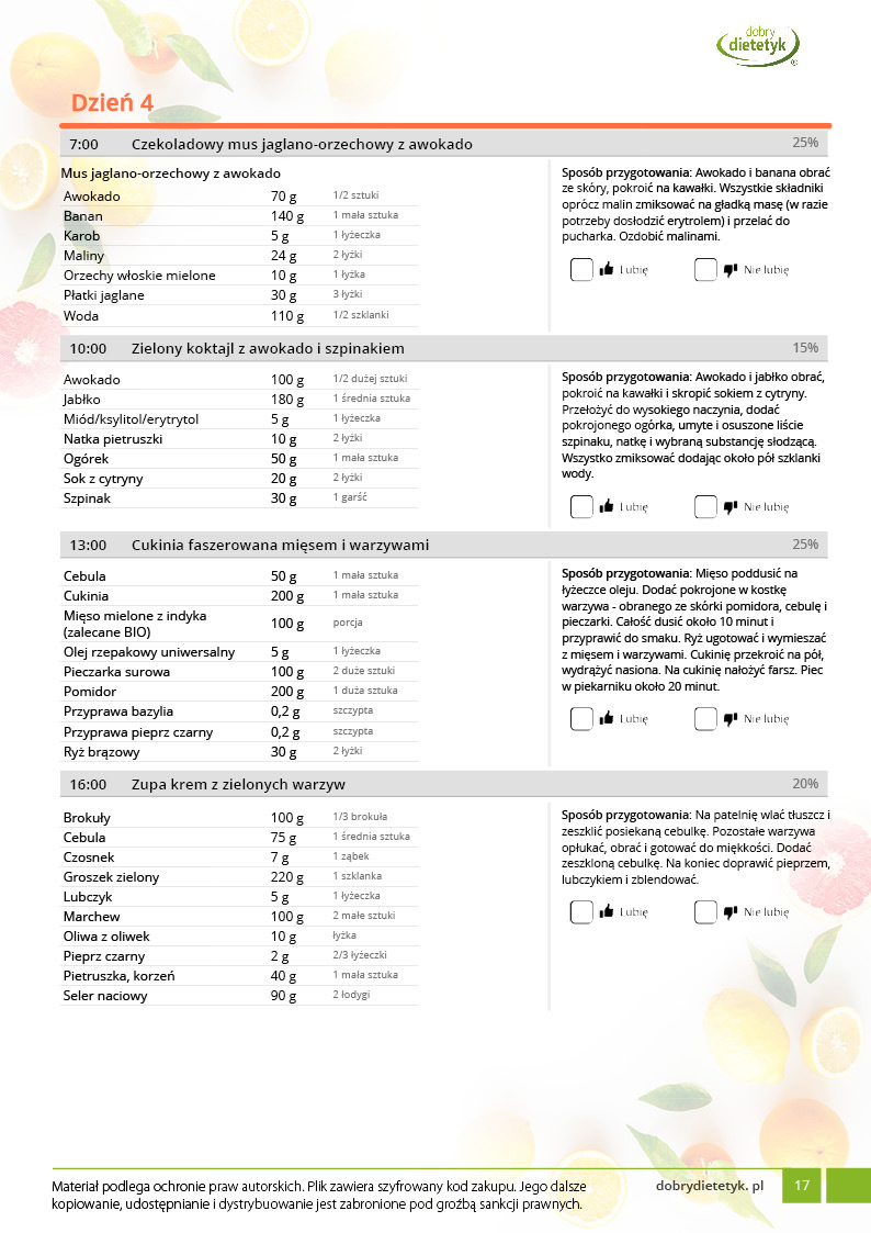 w formie precyzyjnych jadłospisów wielodniowych (na każdy dzień miesiąca jest opracowany osobny jadłospis). Tutaj nie musisz zastanawiać się co zjeść każdego dnia, gdyż będziesz mieć dokładnie wszystko rozplanowane.