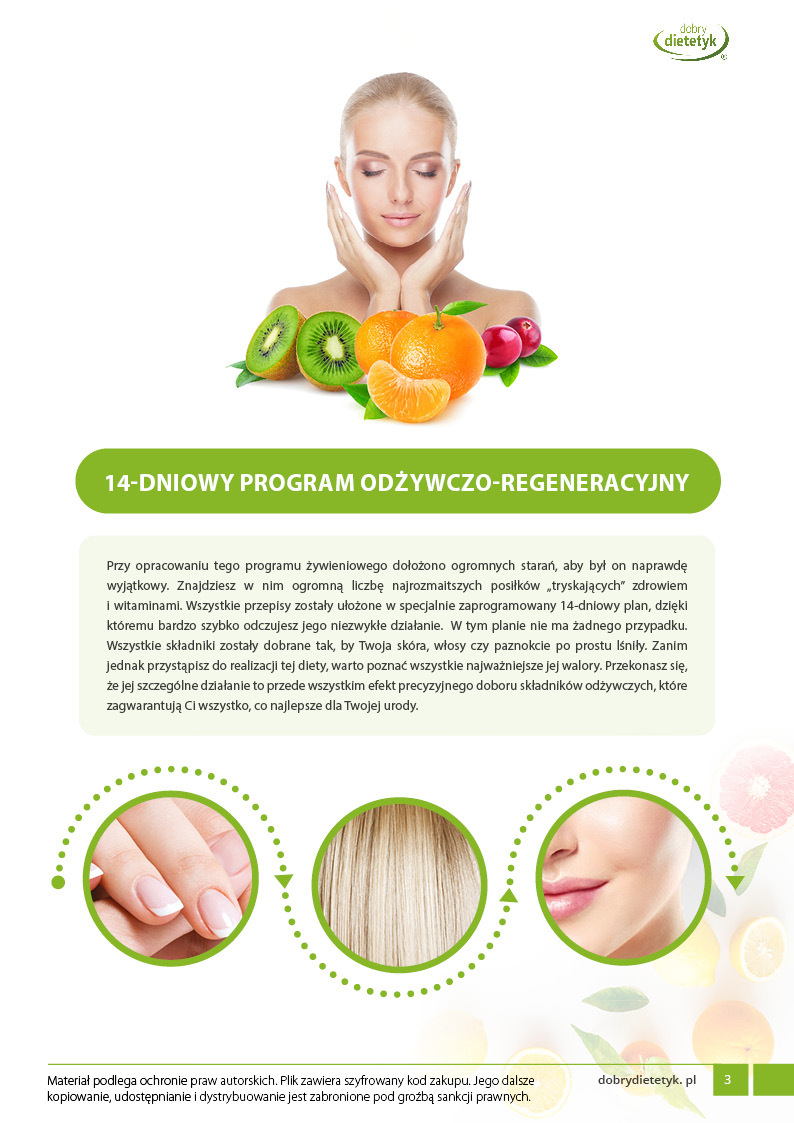 Specjalny Program Dietetyczny wspomagający wygląd i rewitalizację ciała u kobiet z naciskiem na redukcję cellulitu. W diecie uwzględniono najważniejsze składniki odżywcze wpływające nie tylko na napięcie, gładkość i zdrowy wygląd skóry ale także na poprawę kondycji włosów i paznokci. Dieta sprawdza się doskonale w terapiach odchudzających a także po zabiegach kosmetologicznych, dermatologicznych i antycellulitowych. Dzięki niezwykle bogatemu wysyceniu naturalnymi składnikami odżywczymi i oczyszczającymi dieta nie wymaga stosowania żadnych dodatkowych suplementów. Dieta z powodzeniem może być stosowana przez dłuższy okres czasu.
