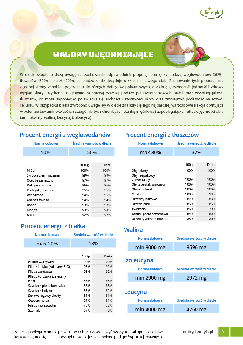 Dodatkowo do opracowanego planu dietetycznego otrzymasz atrakcyjnie przygotowane ciekawostki i wiadomości żywieniowe, które mam nadzieję pozwolą Ci zrozumieć wiele spraw związanych z nurtującym Cię problemem, a także przyczynią się do zwiększenia ogólnej wiedzy żywieniowej.
