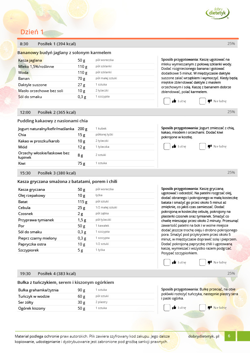 w formie precyzyjnych jadłospisów wielodniowych (na każdy dzień miesiąca jest opracowany osobny jadłospis). Tutaj nie musisz zastanawiać się co zjeść każdego dnia, gdyż będziesz mieć dokładnie wszystko rozplanowane.