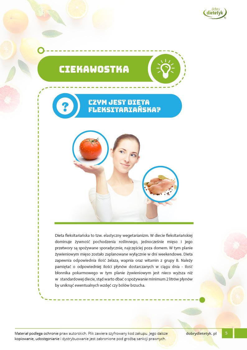 Kompleksowy program dietetyczny dla kobiet które nie chcą w pełni rezygnować z jedzenia mięsa a jedynie mocno je ograniczyć. Taki sposób żywienia niesie za sobą sporo korzyści zdrowotnych, gdyż opiera się głównie na produktach roślinnych ale też poprzez niewielki dodatek mięsa zabezpiecza przed różnymi niedoborami żywieniowymi. Ta dieta polecana jest osobom, które chcą spróbować wegetariańskiego modelu odżywiania ale jednocześnie nie chcą w 100% eliminować produktów odzwierzęcych. Dieta jest więc zdroworozsądkowa i cieszy się obecnie ogromnym powodzeniem. Program dietetyczny został specjalnie opracowany przez zespół dietetyków aby zabezpieczyć najważniejsze wartości odżywcze.