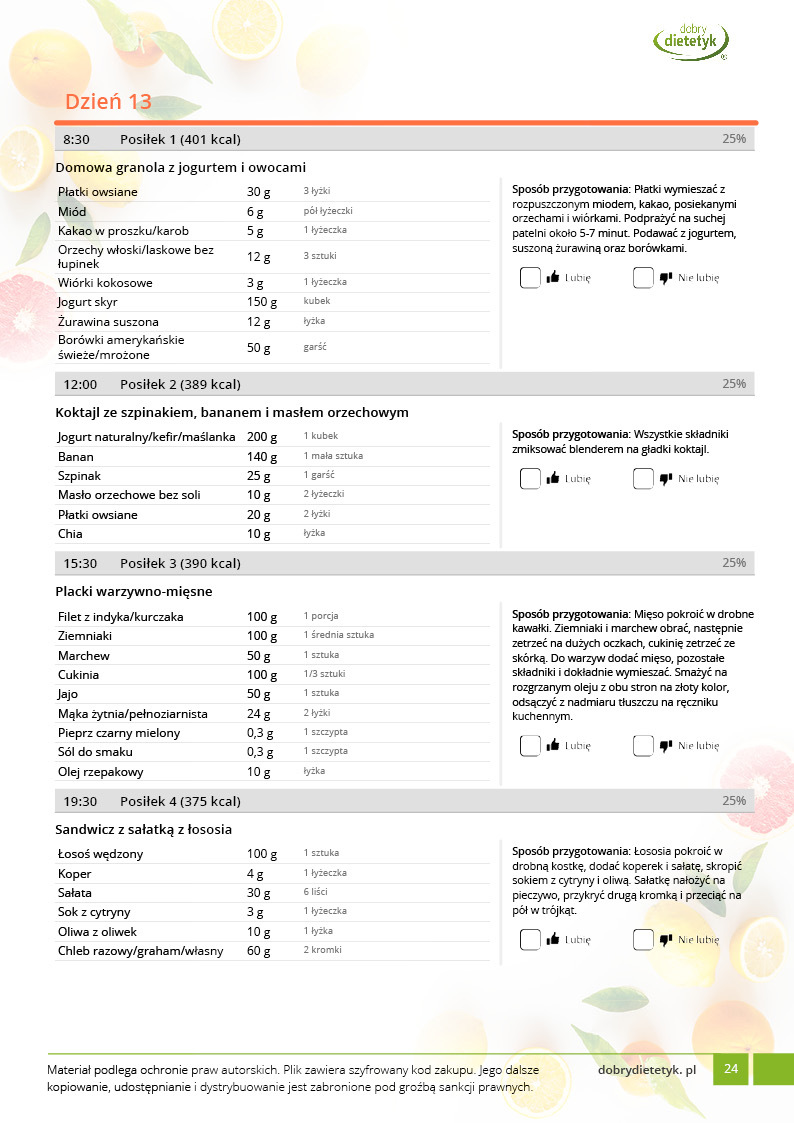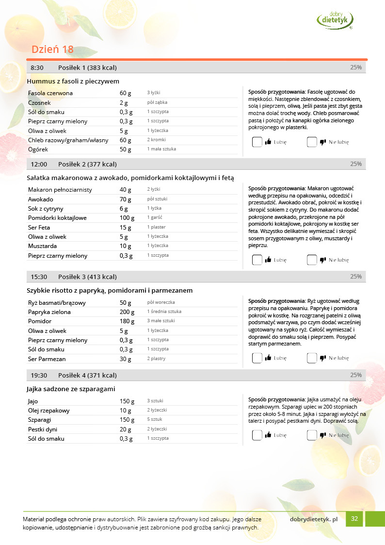 w formie propozycji posiłków (zamiast pojedynczych jadłospisów jednodniowych, przygotowano propozycje kilku propozycji dań na każdy posiłek). Tutaj nie uzależniamy Cię od tego jakie masz np. w danym dniu zjeść śniadanie czy obiad, tylko sam wybierasz sobie ulubione danie z kilku przedstawionych przez nas propozycji.