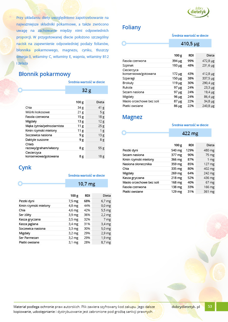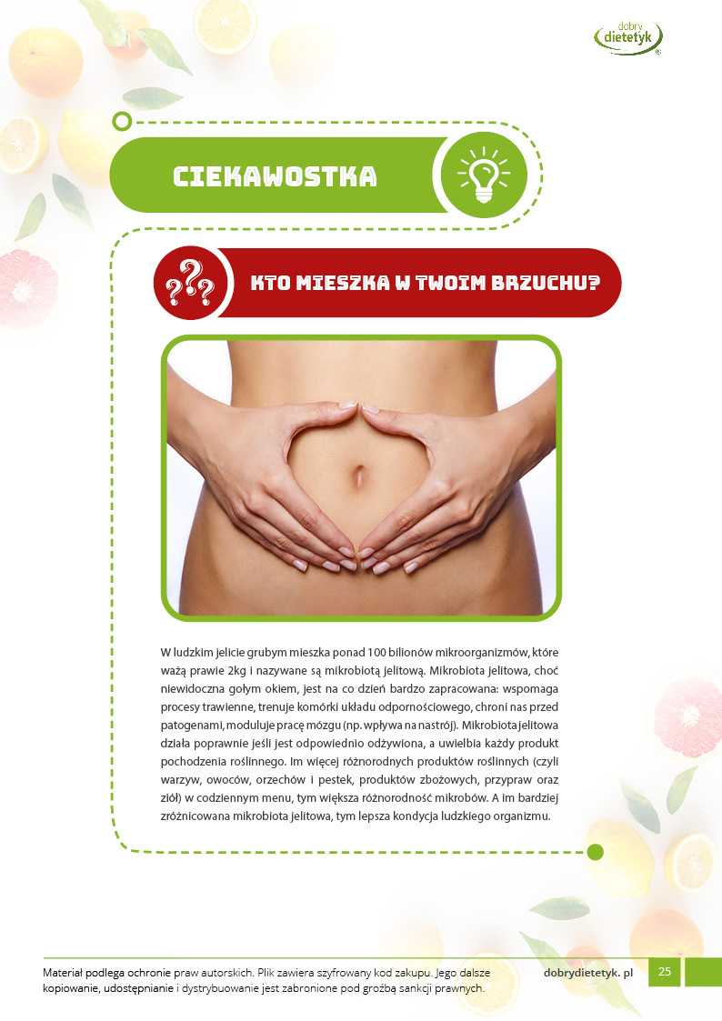 Dodatkowo do opracowanego planu dietetycznego otrzymasz atrakcyjnie przygotowane ciekawostki i wiadomości żywieniowe, które mam nadzieję pozwolą Ci zrozumieć wiele spraw związanych z nurtującym Cię problemem, a także przyczynią się do zwiększenia ogólnej wiedzy żywieniowej.