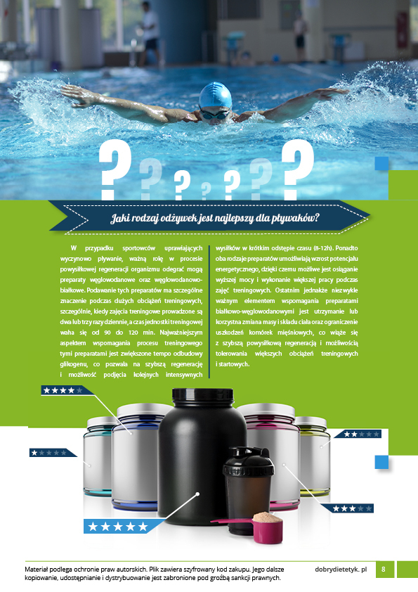 Kompleksowy program żywieniowy dla osób trenujących pływanie zawodowo lub amatorsko. Jadłospis na 30 dni został skomponowany z myślą o pływakach, tak, by wspomóc osiągnięcia sportowe i regenerację organizmu. Pierwsze posiłki w ciągu dnia doskonale sprawdzą się jako posiłek przedtreningowy (koktajle, kasze z owocami, owsianki i omlety), kolejne dania to łatwe do zabrania na wynos potrawy (kanapki, placuszki, naleśniki, jogurty). Dodatkowo jeden z 6 posiłków to naturalny, domowy izotonik przeznaczony do spożycia w trakcie treningu. Kolejność posiłków można zmieniać dowolnie tak, by dopasować w razie potrzeby do rozkładu jednostek treningowych w ciągu dnia.