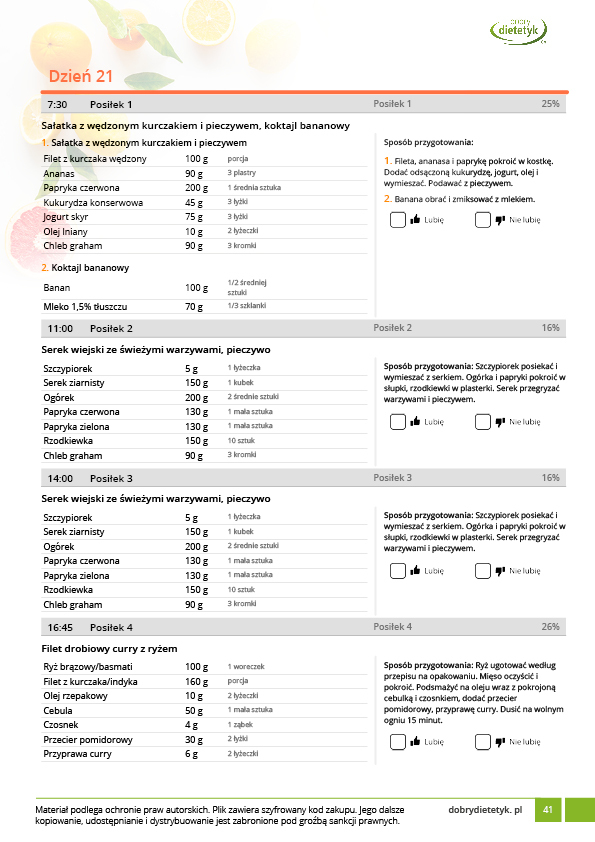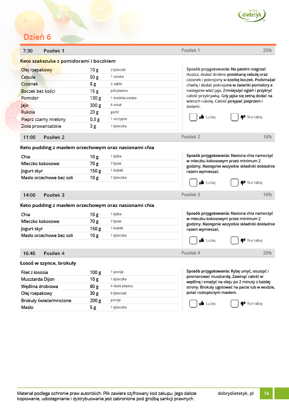 w formie propozycji posiłków (zamiast pojedynczych jadłospisów jednodniowych, przygotowano propozycje kilku propozycji dań na każdy posiłek). Tutaj nie uzależniamy Cię od tego jakie masz np. w danym dniu zjeść śniadanie czy obiad, tylko sam wybierasz sobie ulubione danie z kilku przedstawionych przez nas propozycji.