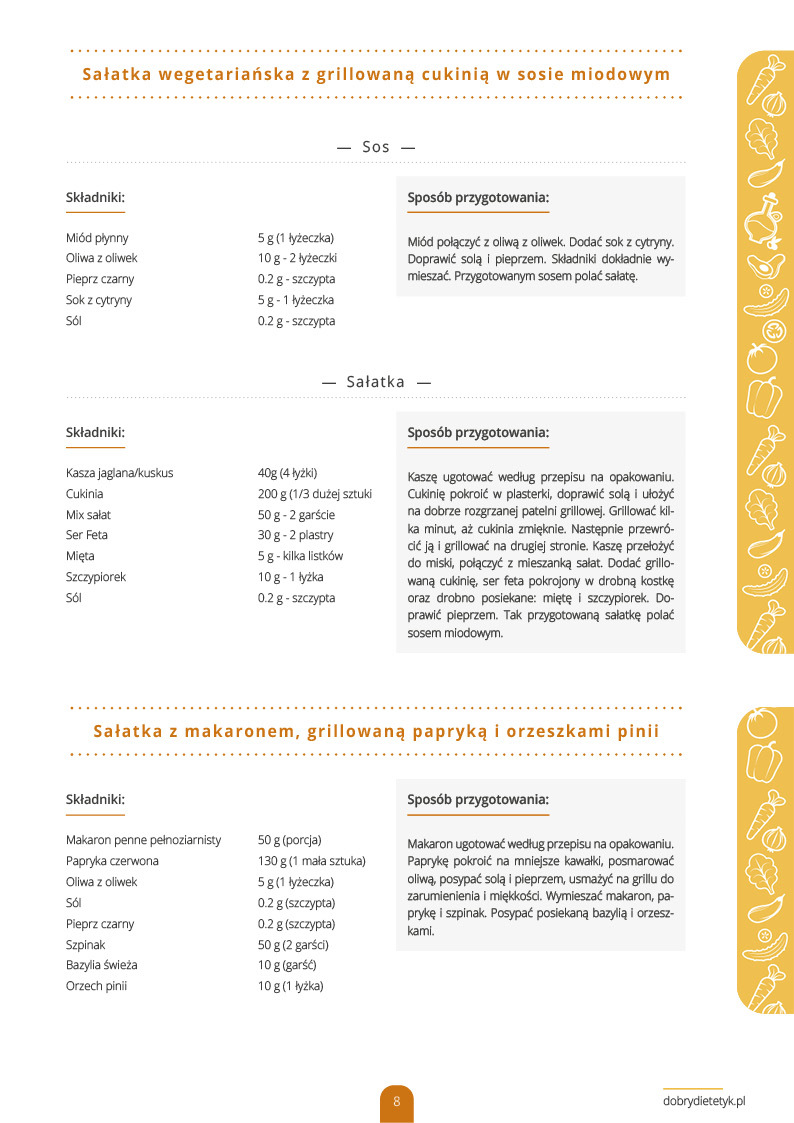 E-book zawiera 35 wspaniałych i wyjątkowo smacznych posiłków opracowanych specjalnie na grilla. Dania zostały opracowane przez zespół dietetyków, aby były nie tylko smaczne ale także zdrowe i bardzo pożywne. Wiosenno-letnie grillowanie nie musi ograniczać się jedynie do kiełbasy i karkówki. Dania z grilla mogą być także smaczne, kolorowe i oryginalne. Zaskocz więc rodzinę i znajomych niekonwencjonalnym pomysłem kulinarnym!