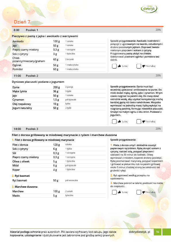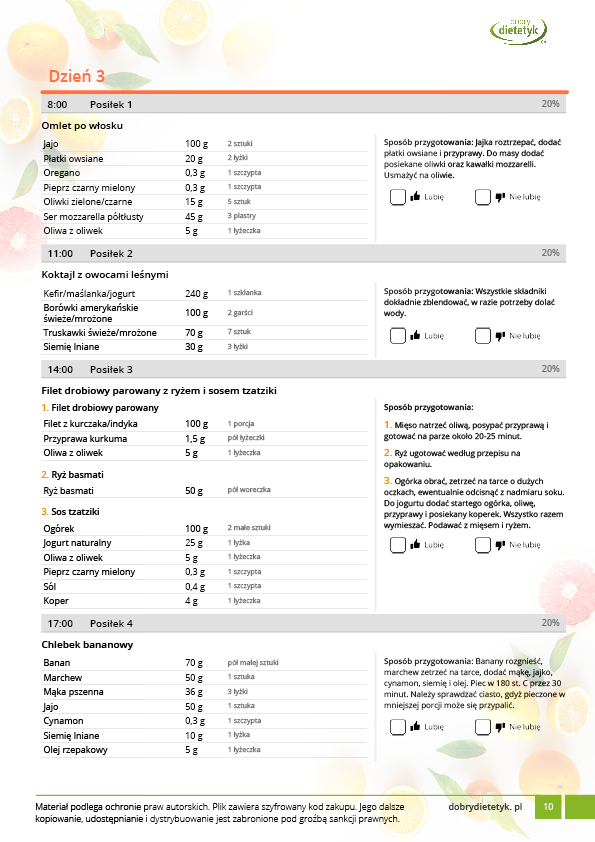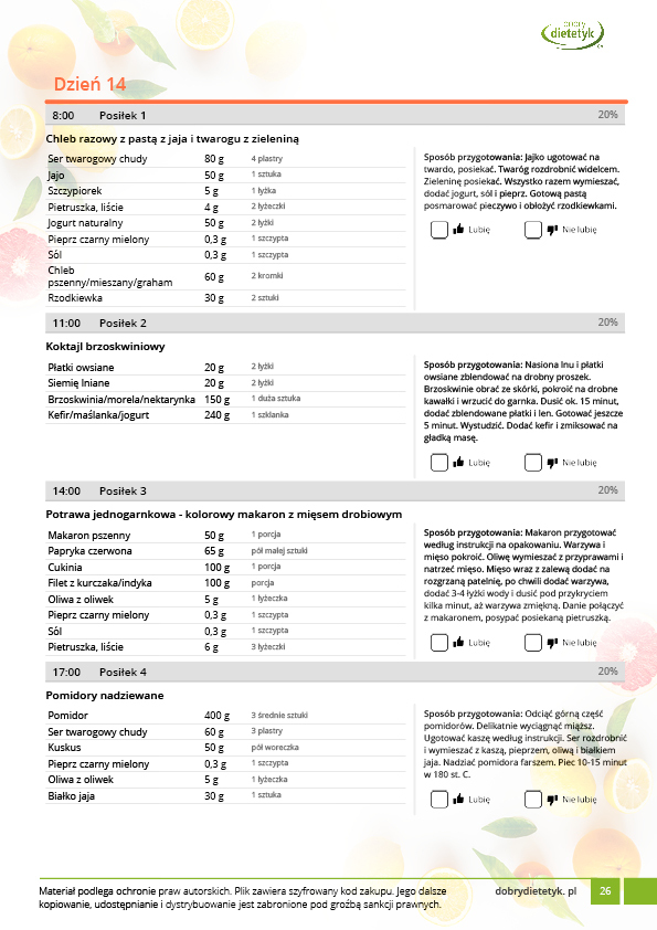 w formie propozycji posiłków (zamiast pojedynczych jadłospisów jednodniowych, przygotowano propozycje kilku propozycji dań na każdy posiłek). Tutaj nie uzależniamy Cię od tego jakie masz np. w danym dniu zjeść śniadanie czy obiad, tylko sam wybierasz sobie ulubione danie z kilku przedstawionych przez nas propozycji.