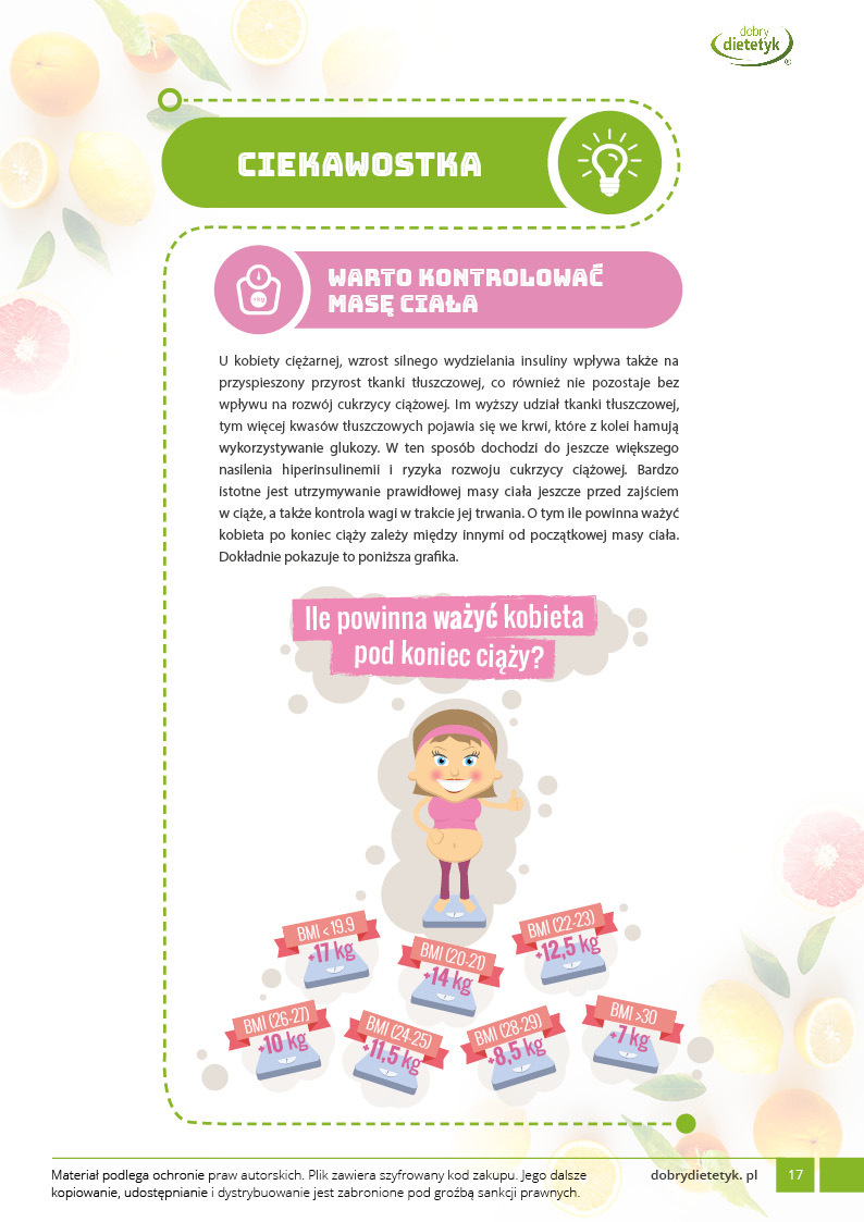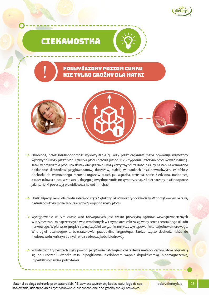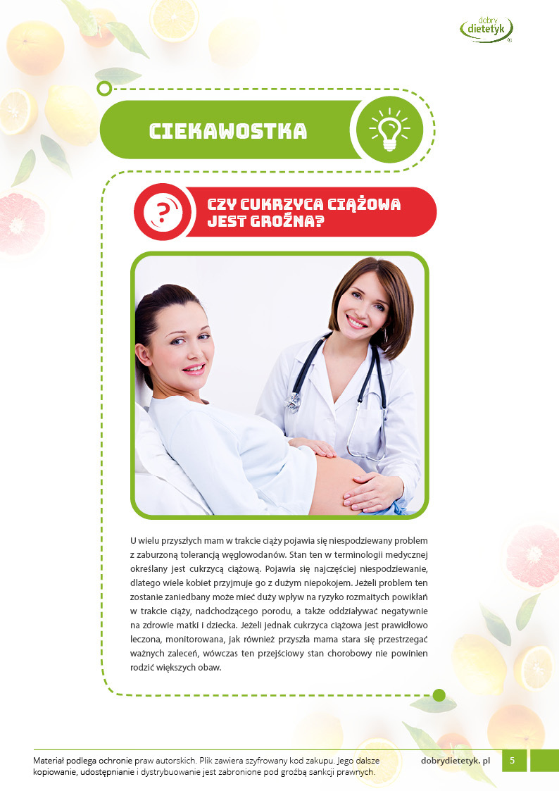 Specjalnie opracowany program żywieniowy z przeznaczeniem dla przyszłych mam borykających się z problemem cukrzycy ciążowej. Uwzględnia 30-dniowy jadłospis z 6 posiłkami w ciągu dnia. Plan żywieniowy ma za zadanie nie dopuszczać do wysokich wartości glukozy we krwi, kontrolować odpowiedni przyrost masy ciała a także zapewnić prawidłową podaż wartości odżywczych niezbędnych dla prawidłowego rozwoju dziecka. Dieta została skomponowana z produktów o niskim indeksie glikemicznym i może być stosowana przy leczeniu insuliną. Jednocześnie zwrócono uwagę na najważniejsze składniki mineralne w ciąży między innymi żelazo, cynk, wapń i foliany.