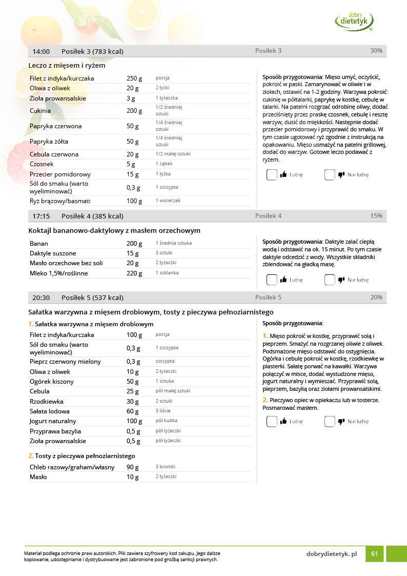 w formie propozycji posiłków (zamiast pojedynczych jadłospisów jednodniowych, przygotowano propozycje kilku propozycji dań na każdy posiłek). Tutaj nie uzależniamy Cię od tego jakie masz np. w danym dniu zjeść śniadanie czy obiad, tylko sam wybierasz sobie ulubione danie z kilku przedstawionych przez nas propozycji.