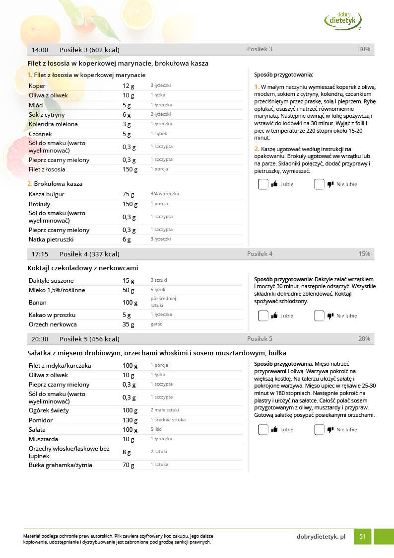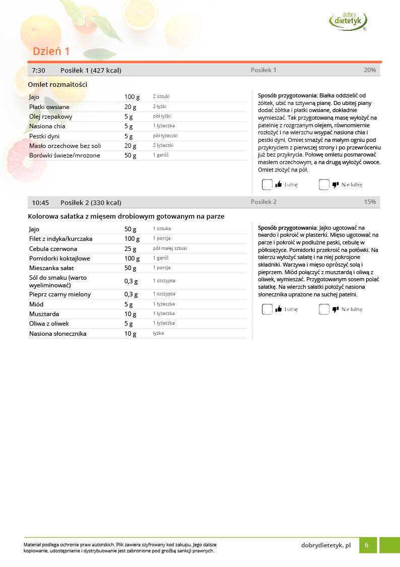 w formie propozycji posiłków (zamiast pojedynczych jadłospisów jednodniowych, przygotowano propozycje kilku propozycji dań na każdy posiłek). Tutaj nie uzależniamy Cię od tego jakie masz np. w danym dniu zjeść śniadanie czy obiad, tylko sam wybierasz sobie ulubione danie z kilku przedstawionych przez nas propozycji.