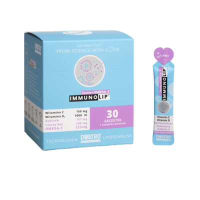 Wysoko przyswajalny unikalny kompleks witamin C, D i w połączeniu z ekstraktem z bzu czarnego oraz wegańskimi kwasami omega-3 z oleju z mikrolag i rokitnika w technologii liposomalnej.