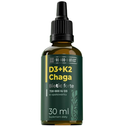Suplement diety w kroplach, z wysoką dawką wit. D3 oraz K2 MK-7, ekstraktem chagi i siedmioma szczepami pożytecznych bakterii. Produkt przeznaczony wyłącznie dla osób zdrowych powyżej 75. roku życia.