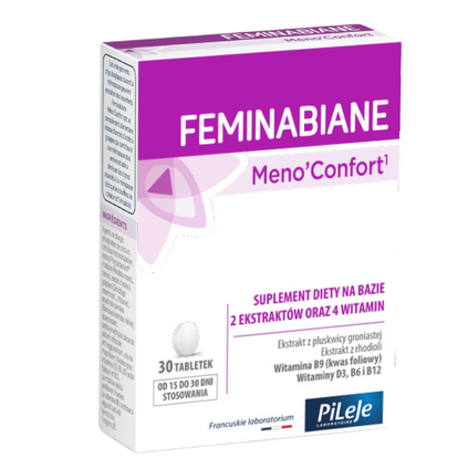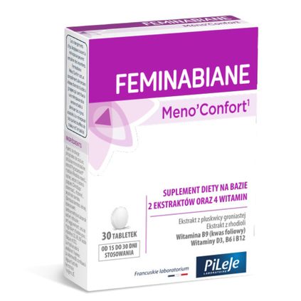 Feminabiane Meno’Confort to suplement diety na bazie ekstraktów z pluskwicy groniastej i rhodioli oraz witamin (D3, B6, kwasu foliowego, B12). Ekstrakt z pluskwicy groniastej przyczynia się do złagodzenia uciążliwych objawów menopauzy, takich jak uderzenia gorąca i drażliwość. Rhodiola wpływa na poprawę nastroju. Witamina B6 pomaga regulować poziom hormonów. Przeciwwskazania: Nie zaleca się stosowania przez kobiety w ciąży i karmiące piersią oraz osobom, które zmagają się z dolegliwościami wątroby.Rekomendowany do suplementacji w:
