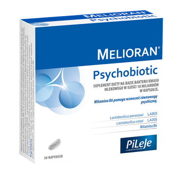Melioran Psychobiotic jest specjalnie opracowanym suplementem diety przeznaczonym dla osób w sytuacjach regularnego stresu czy lęku. Suplement diety na bazie specjalnie wyselekcjonowanych szczepów mikrobiotycznych z dodatkiem witaminy B6. Przeciwwskazania: Ten suplement diety nie jest zalecany do przyjmowania przez kobiety w ciąży i karmiące piersią, osoby z chorobą afektywną dwubiegunową i dzieci.Rekomendowany do suplementacji w: