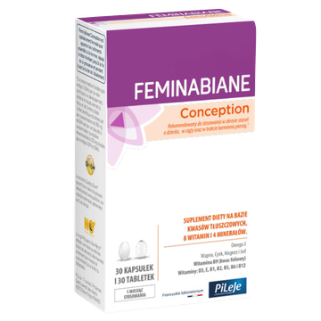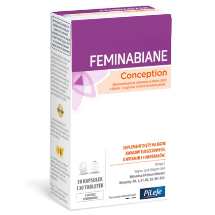 Feminabiane Conception jest specjalnie opracowanym suplementem diety dostarczającym składniki odżywcze niezbędne dla organizmu kobiety w okresie starań o dziecko, w trakcie ciąży aż do zakończenia karmienia dziecka piersią. Suplement diety na bazie kwasów tłuszczowych Omega 3, 8 witamin oraz 4 minerałów.Rekomendowany do suplementacji w: